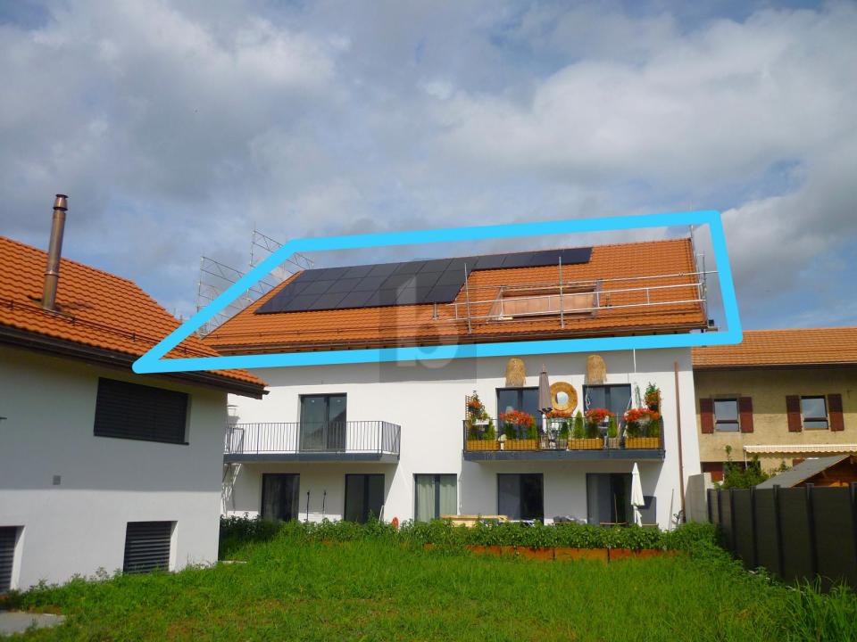 À Villars-Bozon, charmant village proche de LIsle, découvrez ce dernier appartement disponible au sein dune ferme villageoise entièrement rénovée. Situé au 2ᵉ étage (sans ascenseur), ce spacieux logement séduit par ses volumes, sa lumière naturelle et son cachet unique sous toiture. Idéal pour une famille, il se compose dun hall extérieur, dune salle deau avec espace buanderie, dun réduit, de deux chambres (dont une avec mezzanine), ainsi quune splendide suite parentale avec dressing et salle deau. Lespace de vie propose une grande cuisine ouverte sur la salle à manger et un salon en mezzanine (pouvant faire office de bureau). Le tout est complété par un balcon baignoire, un jardin privatif, une cave et deux places de parc en sous-sol.Cette offre de BETTERHOMES se caractérise par les avantages suivants: